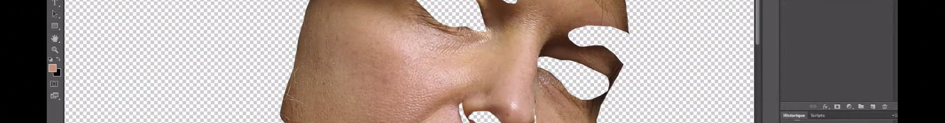 Rentrons maintenant dans le vif du sujet de cette vidéo, soit l’amélioration de la surface d’un visage ou la réduction des petites imperfections présente sur la peau de toute personne. C’est encore plus utile si votre modèle n’a pas été maquillé. Je rappelle que cette technique ne remplace pas un maquillage, mais en son absence, cela peut grandement améliorer votre image. Nous allons donc ouvrir notre photo. À ce stade il est intéressant de regarder si le visage présente de petites zones fortement marquées ou des boutons. Il est préférable de les retirer par l’emploi du tampon de Photoshop. Cela va vous permettre d’aller moins loin dans le lissage de la peau. Une fois les plus grosses imperfections retirées, vous allez sélectionner, avec le lasso, le visage. Vous commencez par prendre tout le visage sans pour autant allez jusqu’au bord de celui-ci. Gardez une petite marge pour ne pas toucher les bords et vous permettre si besoin de mieux les lisser. Maintenant, il va falloir retirer de cette sélection les zones que l’on ne veut pas traiter, donc que l’on ne veut pas lisser. Vous retirez donc les yeux, la bouche, les arrêtes du nez et les sourcils. En faisant un copier/coller, vous allez obtenir un calque ou est présent la peau à traiter.